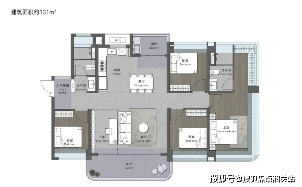 131-132㎡四房:270°环幕阳台、50㎡大方厅,视野与尺度兼得;