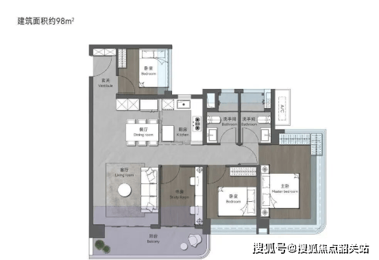 98㎡创意四房:LDKB一体化设计,小户型也能实现四房两卫,适合年轻家庭一步到位;