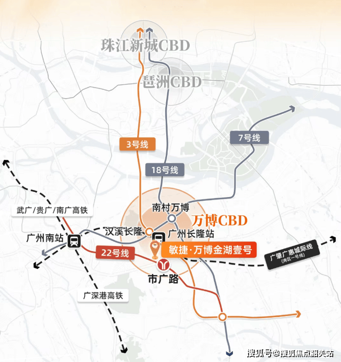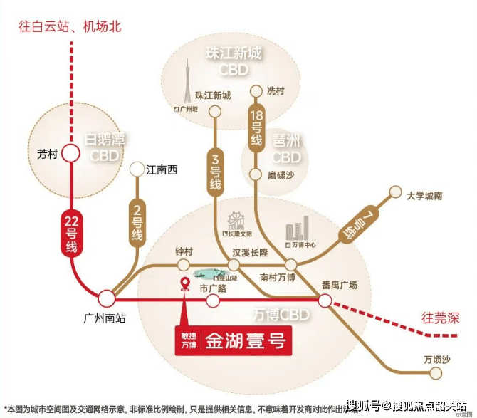 便捷高效的交通网络,是连接家与世界的纽带。敏捷·万博金湖壹号在交通方面的优势,堪称其核心竞争力之一。项目距离已开通运营的广州地铁22号线市广路站仅约800米(百度地图直线距离),步行即可轻松抵达。22号线作为一条设计时速高达160公里的高速地铁,其通勤效率远超普通线路。从市广路站出发,1站即可到达广州南站,无缝换乘高铁网络;2站直达万博CBD核心;3站抵达琶洲会展及电商总部区;4站即可进入珠江新城金融心脏地带。此外,规划中的26号线也将在此设站,这条被誉为“3号线姐妹线”的新动脉,拥有极多的换乘节点,未来将快速串联起体育西、珠江新城、金融城、二沙岛等城市核心功能区,进一步放大项目的通勤优势。