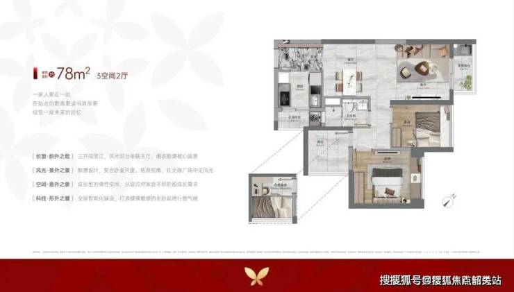 76-78㎡三房一卫:三开间望江,主卧次卧全带飘窗,总价280万起,白鹅潭最小面积江景房;