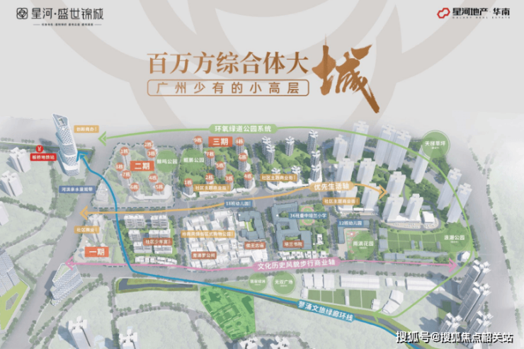 星河·盛世锦城坐落于广州番禺区,紧邻板桥地铁站C口约500米,总建筑面积约114万平方米,规划户数达2600户。该项目由千亿级企业星河集团开发,旨在为居住者提供一个集便捷交通、丰富商业配套和优质教育资源于一体的城市低密大城。