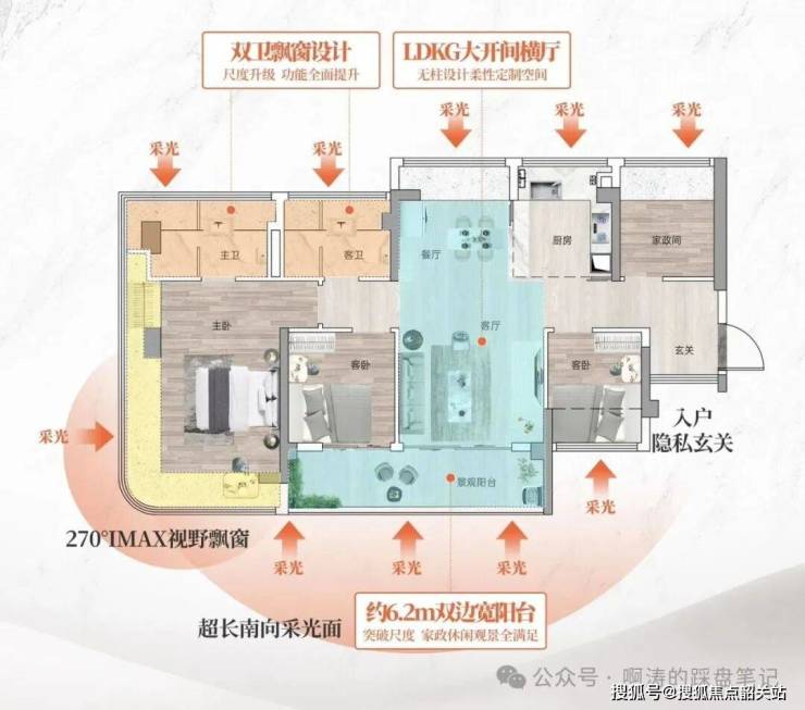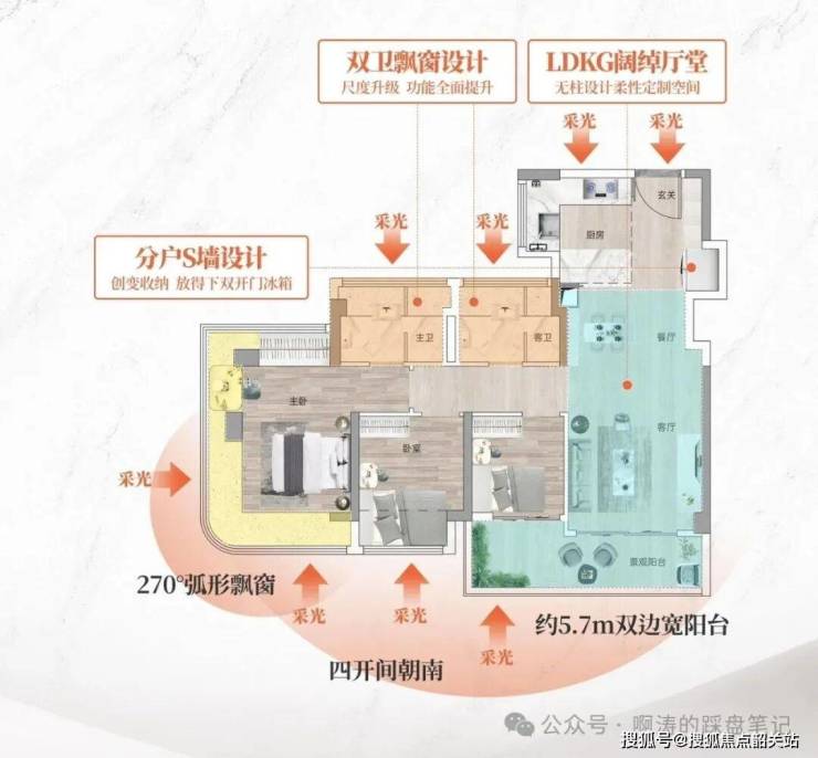 项目户型设计融入多项人性化细节,最大化提升居住舒适度与空间利用率。全系户型采用分户 S 墙设计,可预留嵌入式冰箱位置,既节省了室内空间,又提升了空间的整洁度;所有户型均采用动静分区设计,将活动区与休息区明确分隔,既保障了公共活动空间的开阔性,又保障了休息区的私密性;全系户型均配备独立入户玄关,打造入户过渡空间,既保障了居家私密性,又提供了充足的收纳空间;主卧均采用套房设计,配备独立卫生间与观景飘窗,部分户型配备 270° 弧形玻璃幕窗,最大化拓展观景视野与采光面,打造专属的私密舒适居住空间。