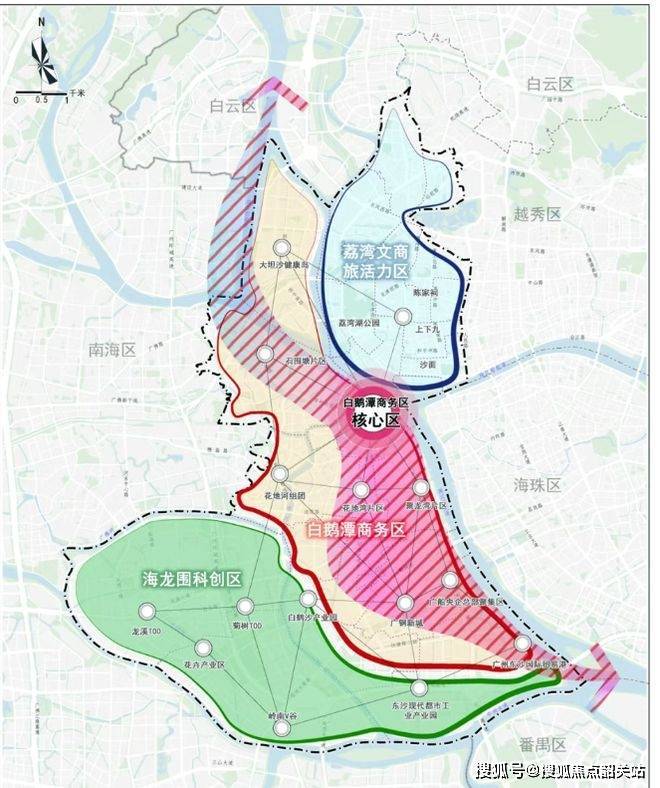 白鹅潭以 “3 + 2” 产业体系为核心规划,重点发展总部经济、医药健康、新兴服务三大产业,叠加现代商贸、文旅两大特色产业。目前已形成 12 大产业组团,商业配套更是呈现爆发式增长。