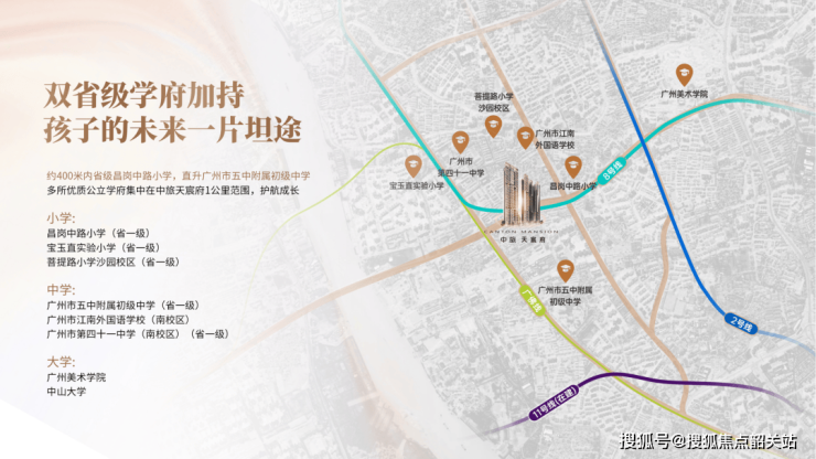 项目所在的海珠区最强教育板块,直接对口省一级昌岗中路小学(距项目约500米),中学则采用电脑派位方式入学,包括广州市五中附属初级中学和南武中学等优质学校。优质的教育资源为孩子的成长提供了坚实的基础。