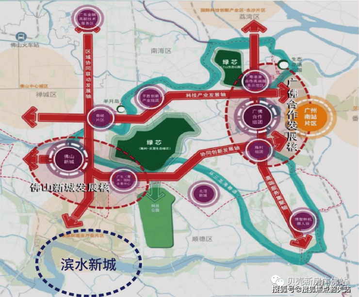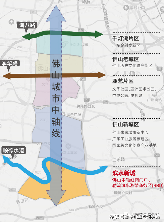 依托佛山“强中心”战略下,打造佛山中轴线,把千灯湖、祖庙、亚艺、佛山新城等核心城市群串联起来。随着城市的发展,中轴线延伸至滨水新城,滨水新城成功进级佛山中心城区圈,顺势崛起。
