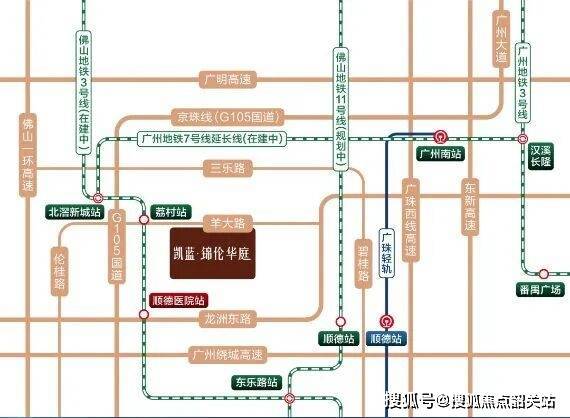 从凯蓝锦伦华庭出发,步行约400米即可抵达已通车的佛山地铁3号线“顺德人民医院”站。该线路在北滘公园站可换乘广州地铁7号线,11站直达广州南站;未来还可衔接规划中的佛山地铁11号线,进一步拓展通勤半径。自驾方面,项目紧邻“二横六纵”路网,“二横”为龙洲路与广州绕城高速,“六纵”包括105国道、碧桂路、佛山一环等主干道,2分钟内可驶入高速入口。若搭乘广珠城轨,从轻轨顺德站出发,约15分钟抵达广州南,1小时左右可达珠海。