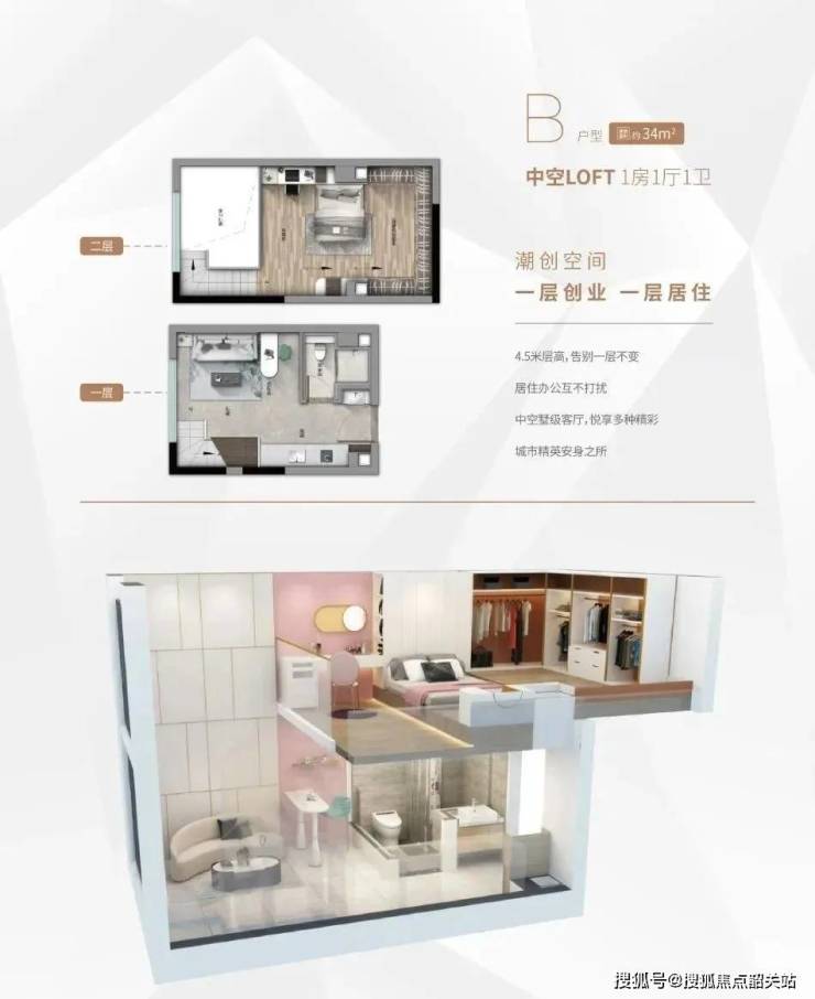 第一款户型:建面约33㎡单身LOFT户型,主打精致单身居所,适配单身精英、过渡期自住者及小额投资者。该户型层高4.5米,采用上下分层设计,一层为客厅、厨房(开放式)、卫生间,二层为卧室及储物空间,空间布局紧凑合理,无浪费空间,实现“麻雀虽小,五脏俱全”。一层客厅开阔明亮,采光通风俱佳,可作为日常休闲、接待朋友的空间;开放式厨房设计,操作便捷,适合单身人士日常烹饪,满足基本的饮食需求;卫生间干湿分离,干净卫生,避免潮湿滋生细菌。二层卧室空间宽敞,配备储物衣柜,可满足衣物、杂物的存放需求,同时预留了小型书桌位置,可作为办公、学习的空间,兼顾生活与工作。该户型的特色的是空间灵活,可自住可投资,投资门槛低,总价100万起,适合小额投资者,后期出租需求旺盛,租金回报率可观。