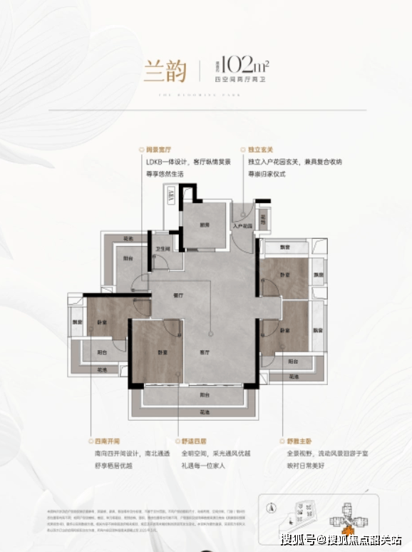 绿城馥香园共规划了5栋住宅(无4号楼),首推的是5#和6#两栋楼,提供建面约102-128平方米的南向三至四房户型。此外,还有少量约85平方米的小户型可供选择。所有户型均为单边位设计,保证了住户的私密性和居住体验,且项目的使用率超过125%。