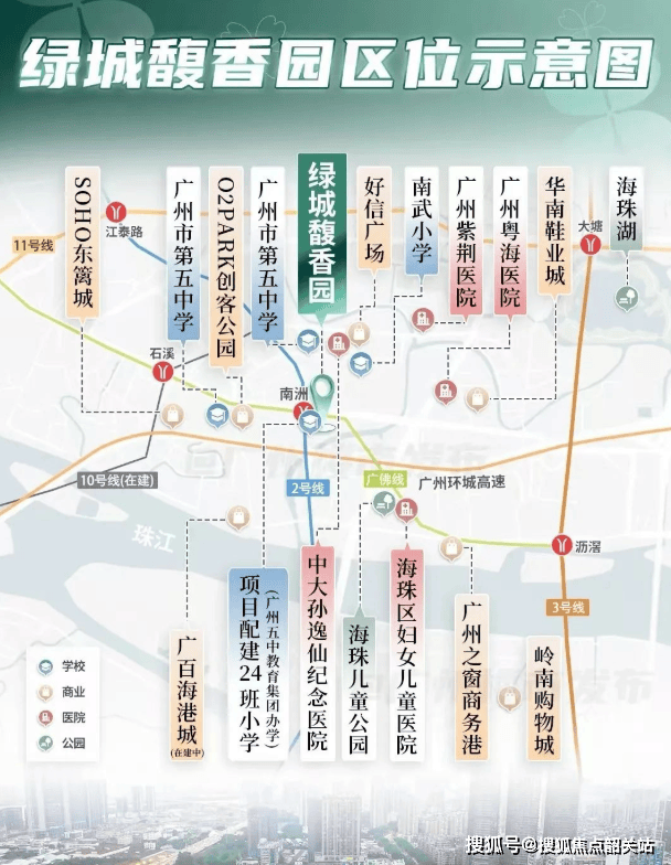 地铁:紧邻2号线和广佛线换乘站南洲站,直线距离仅一百米,且项目将建造一条地下连廊直通地铁,方便业主出行。