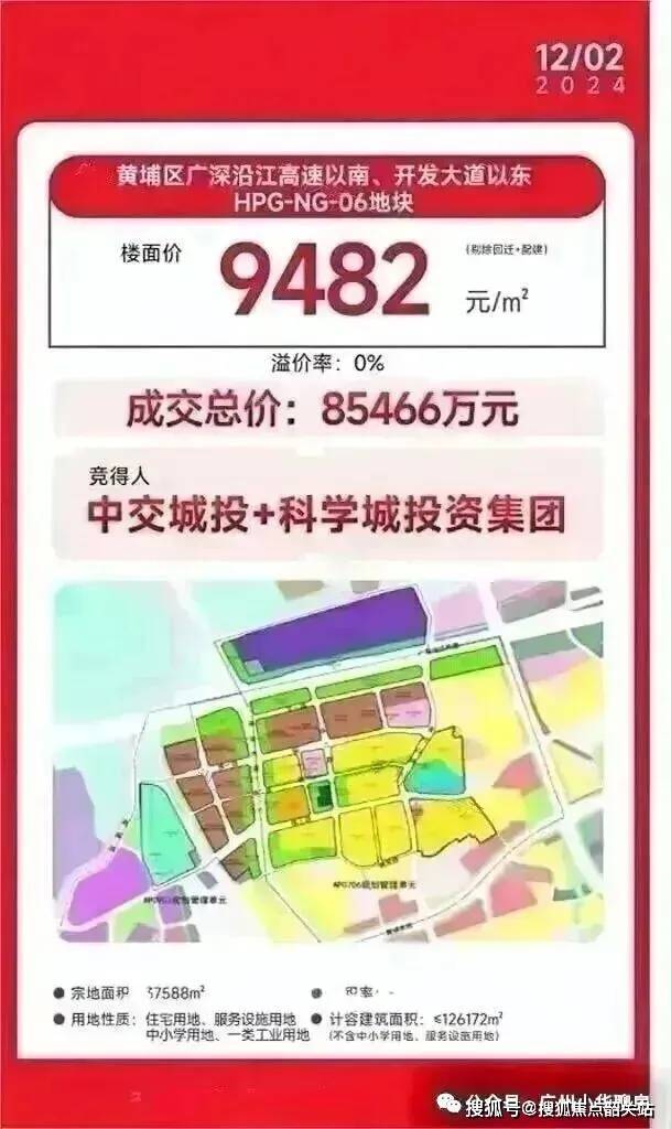 2024 年 12 月 2 日,黄埔区广深沿江高速以南、开发大道以东 HPG-NG-06 地块,由中交城投联合广州峻森投资以底价 85466 万元竞得,折合楼面价 9482 元 /㎡。这块地的特殊性在于:它是黄埔区罕见的招拍挂纯宅地 + 产业 + 教育综合用地,无回迁房、无旧改遗留问题,是真正的 “净地开发”,这在遍地旧改的老黄埔,堪称稀缺中的稀缺。