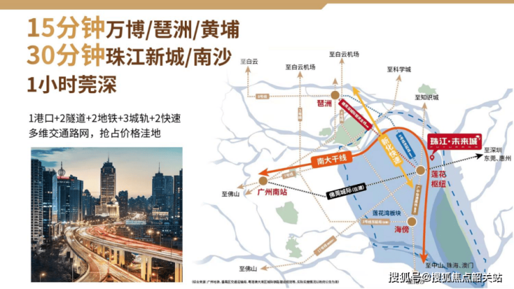珠江·未来城占据着得天独厚的地理位置,坐落于广州双中轴交汇之处,位于莲花湾板块核心,堪称价值黄金地。从城市中轴价值来看,项目处于广州第三中轴——广州科创中轴与番禺财智中轴的交汇处,这使得它成功抢占广深科技走廊之核,周边汇集了广州最先进生产力的产业集群。众多高新技术产业在此蓬勃发展,为区域带来了无限的发展潜力与活力。就湾区核心价值而言,项目所在的莲花湾片区作为广深科创走廊的科创枢纽,处于琶洲、大学城、科创城三大科创高地的黄金三角之芯,战略地位极其重要。它不仅是链接广州南北发展的战略支点,还是承接大学城科研成果转化的承载区,更是缝合珠江口两岸的关键节点。凭借这些优势,莲花湾吸引了大量人才汇聚,拥有良好的生态环境,在粤港澳大湾区中成为极具潜力的价值洼地,而珠江·未来城正坐落于此,尽享区域发展红利,未来价值不可估量。