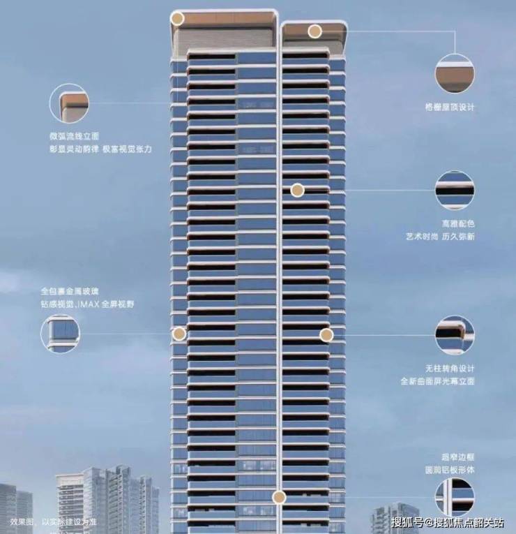 公建立面:公建化曲线流体设计、无柱转角弧形窗、铝板全景玻璃光幕,270°环幕视野媲美鹏瑞一号。