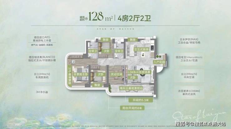 宽境奢宅:迭代新规户型,超100%实用率,约3.1-3.3米层高,南北通透双阳台,LDKB-X百变交互场景,主卧270°宽幕飘窗(部分户型)。