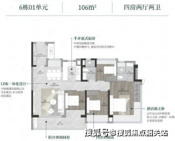 106㎡四房:南北对流,阳台开间约6.5米,主卧套房设计,配备270°瞰景飘窗。