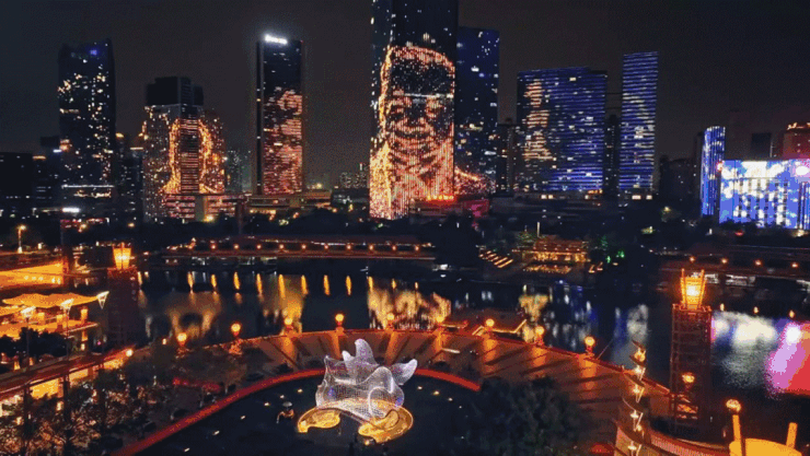 佛山功夫、龙船、醒狮等岭南历史元素“搬”上巨型屏幕,夜光龙船漂移、水幕灯光秀点亮城市夜空,带来一场场震撼的视觉冲击。