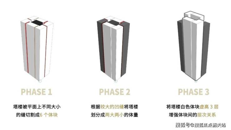 建筑师将塔楼拆分为多个体量,相互间的间隙被设计为共享平台,为中庭空间提供通风和采光。同时由于基础体量比例宽大,多体量规划将使塔楼各个体块的比例更为修长挺拔,形成错落的天际线。