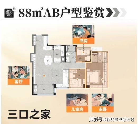 约88㎡四房两卫:主卧套房进深近4米,270°景观飘窗,独立玄关收纳强大,堪称“小户型天花板”;