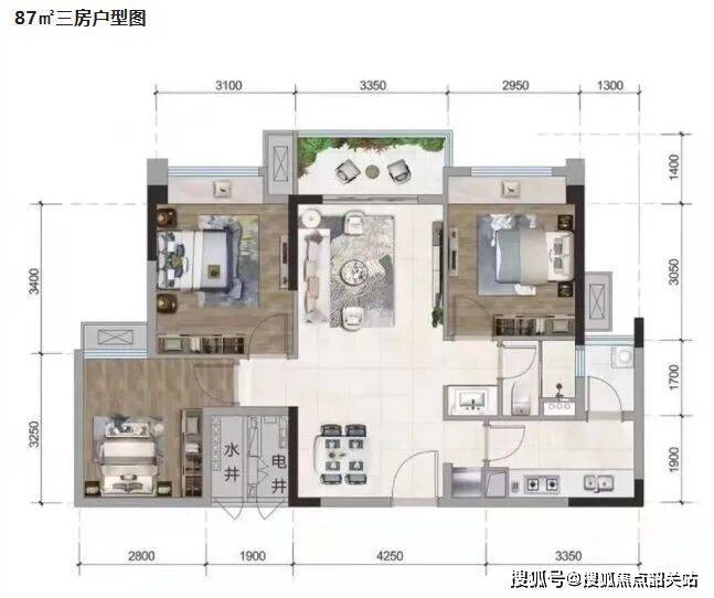 建面约87㎡三房:精巧实用,空间布局合理,满足刚需家庭的基本居住需求。