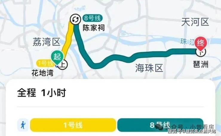 地铁去往琶洲:乘坐1号线,4个站到陈家祠换乘8号线,再坐15个站到琶洲,全程耗时1小时,相对较远。