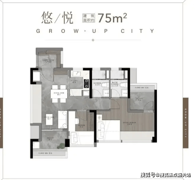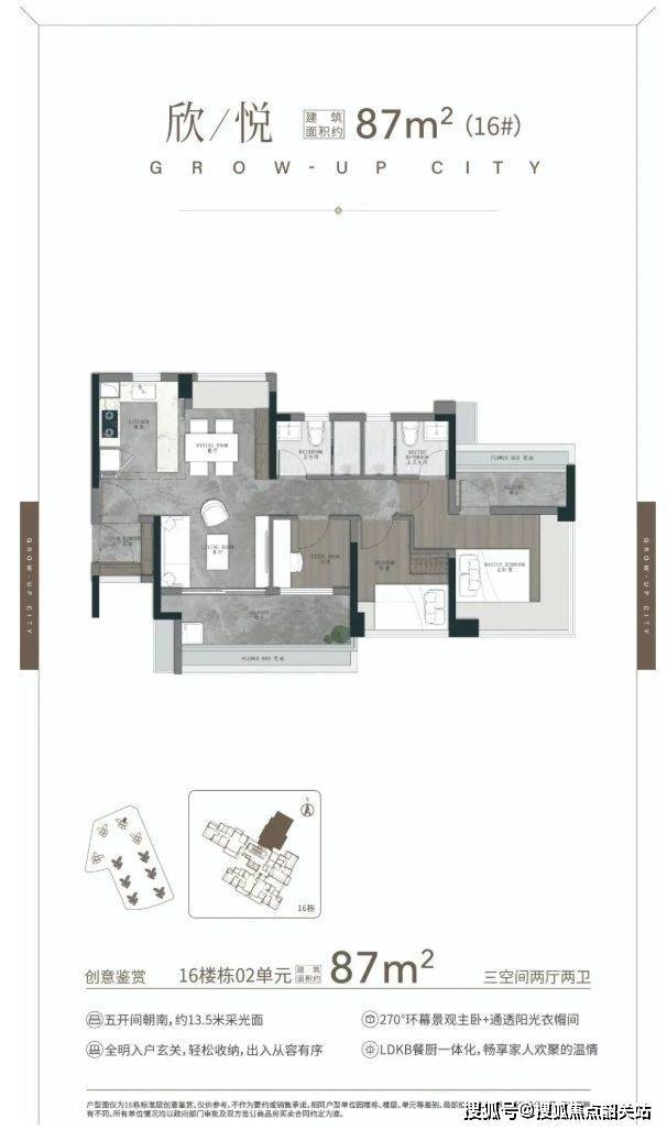 该户型采用4.5开间朝南设计,客厅与主卧双向对流,南北通透,空气流通顺畅。双阳台设计(生活阳台+景观阳台)满足晾晒与休闲需求,交互式方厅可开可合,既可作为家庭聚会场所,也可分隔为独立空间,灵活性高。适合二胎家庭或与老人同住的家庭,总价约330万起。