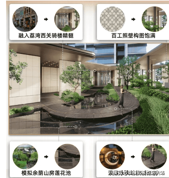 建筑风格上,项目深度融合广府文化元素:外立面提取百年大元帅府的券拱元素,搭配由景德镇 30 年经验老师傅手工制作的 “釉面亮砖”,既保留了老广熟悉的文化记忆,又因亮砖材质耐风吹日晒、历久弥新的特性,兼顾实用性与美观度;社区入口打造玉砚迎宾广场,以 “广府端砚” 为灵感设计迎客锦池,搭配满洲窗菱形纹样、趟栊门等细节,让业主归家充满仪式感与文化归属感。