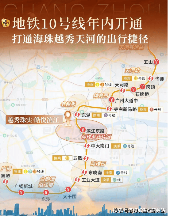 交通出行方面,项目自驾优势显著,通过江湾大桥可直连越秀区,快速抵达天河核心商圈;公共交通虽需接驳,但未来潜力可观 —— 目前 nearest 的 2 号线市二宫站约 1.2 公里,1 站可达江南西或海珠广场,2 站至公园前;东侧在建的 10 号线滨江东站建成后,将实现 1 站到东湖、2 站到五羊邨、3 站到广州大道中,进一步提升通勤便利性。