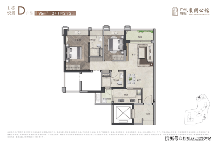 96㎡ 2+1房2厅2卫:紧凑实用,适合年轻家庭或单身人士。