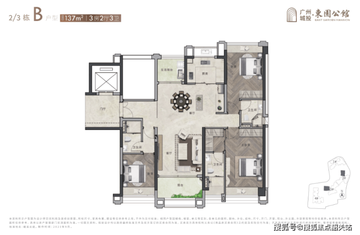 137㎡ 3房带双主套:功能分区合理,适合追求高品质生活的家庭。
