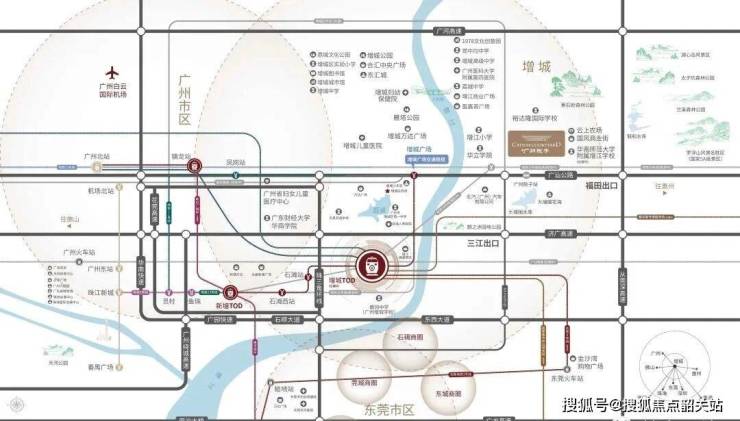 关于交通出行,项目距离规划中的地铁21号线东沿线华立学院站约2.9公里。对于依赖公共交通的居民而言,目前的出行方式更多依赖于社区接驳巴士或自驾。社区内建有约4500平方米的公交始发站,开通了直接到达增城宏发大厦、增城万达等地的楼巴线路。在自驾方面,从济广高速三江出口出发,约5分钟即可驶入高速路网,正常情况下驾车前往天河市区耗时约50分钟。规划中的增天高速建成后,预计从天河到增城的通行时间将缩短至30分钟,这将进一步提升该区域与广州核心区的连接效率,扩大居民的日常活动半径。