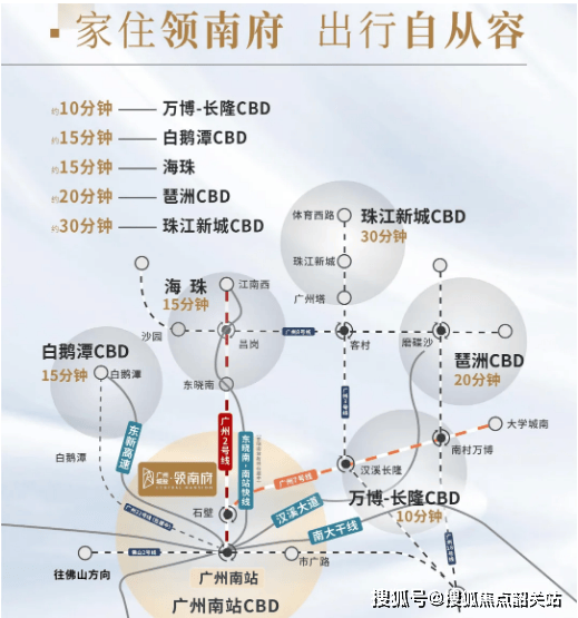 3. 道路交通:项目周边有汉溪大道、南大干线、广明高速、东新高速等多条城市主干道及高速线路,自驾出行便捷。从项目出发,开车5分钟可抵达广州南站,10分钟可抵达长隆旅游度假区,15分钟可抵达万博商圈,25分钟可抵达珠江新城CBD,30分钟可抵达白云机场,路网密集,通达性强,有效节省出行时间。