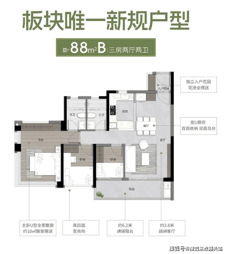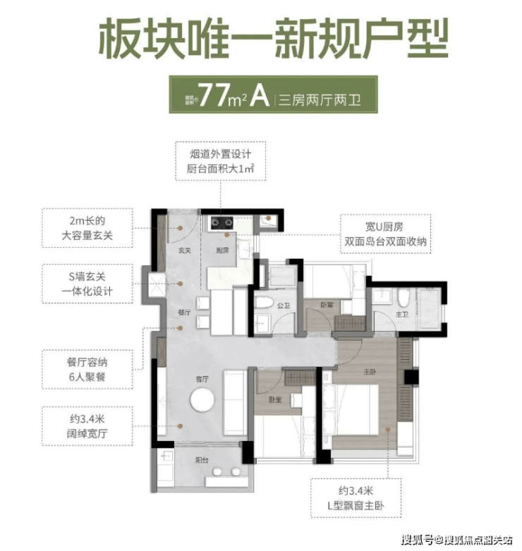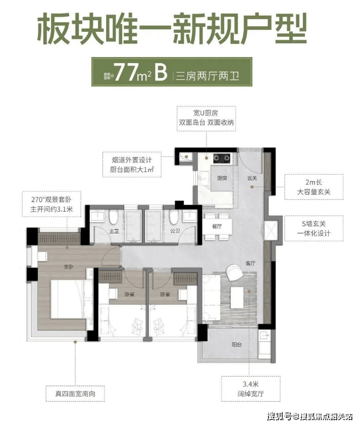 77平方米三房两厅两卫:三面宽南向设计,主卧采用270°全景舱设计,LDKB一体化客厅。