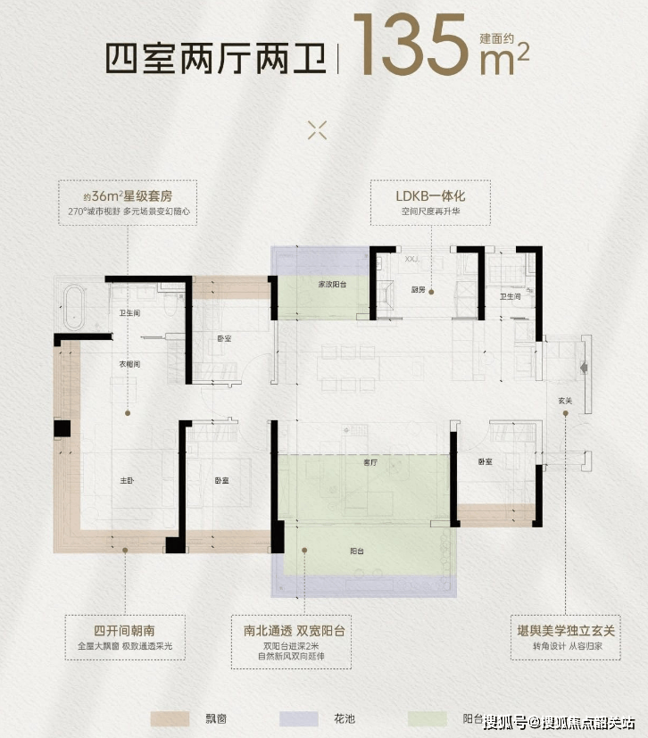 135平方米四房两厅两卫:南北通透双阳台设计,主卧开间约3.6米。