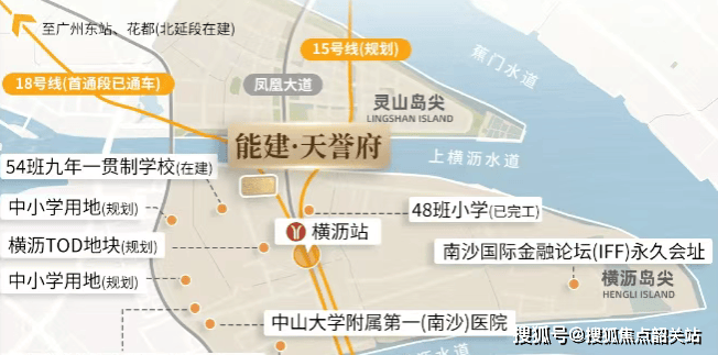 天誉府地处横沥岛尖,地理位置优越,周边配套设施齐全且正在迅速发展。项目临近横沥站,这是一个三地铁交汇的重要交通枢纽,包括已开通的18号线以及即将开通的15号线和中长期规划中的32号线。此外,项目还紧邻广澳高速和南沙港快速路,交通便利性极高。附近还有在建的48班小学和54班九年制学校,预计分别于2025年和2026年开学。中山大学附属第一人民医院(南沙院区)等优质医疗资源也在不远处,为居民提供全面的生活保障。