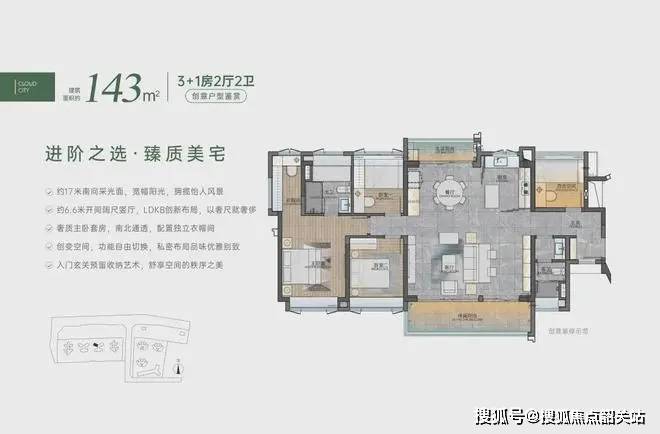 户型面积:建面约72-105㎡3+1房、110-143㎡阔境臻品