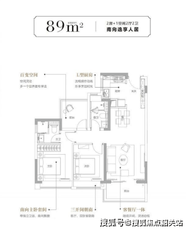 88㎡三房:户型方正实用,空间利用率高,三开间朝南设计保证了充足采光,客厅连接观景阳台,拓展了活动空间,适合新婚夫妻或三口之家,精装标准贴合日常居住需求,即买即住。