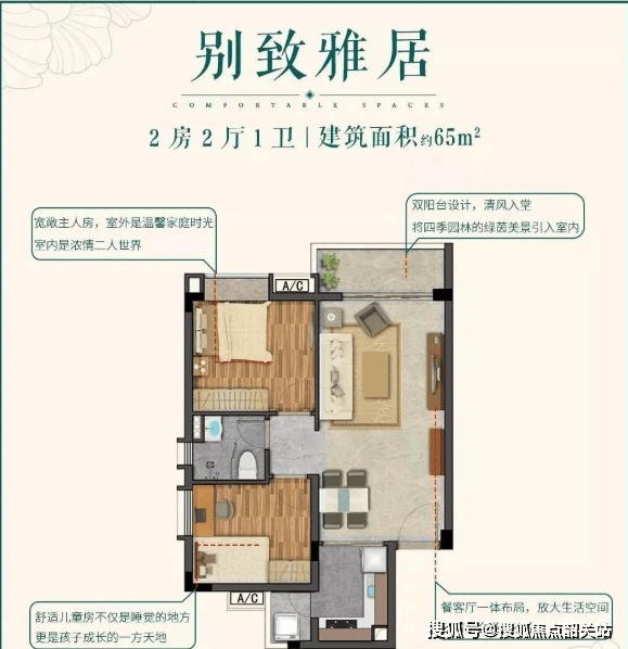 约65㎡两房两厅一卫:该户型在板块内极为稀缺,双阳台设计提升了空间使用效率,功能分区合理,空间感非常出色。