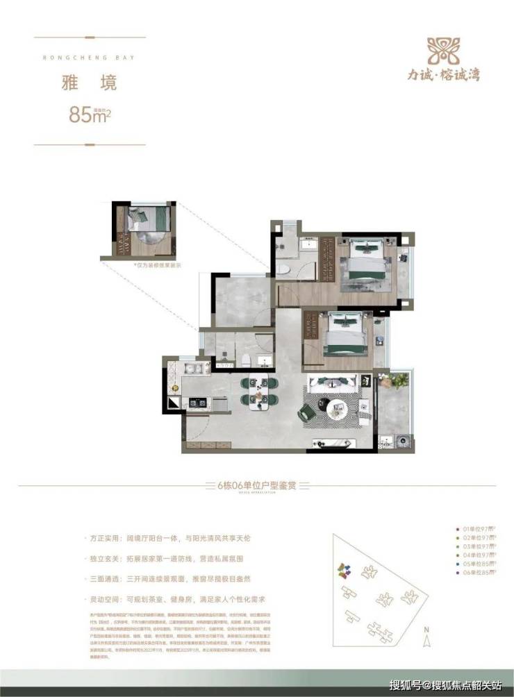 85㎡三房:南北通透,主卧带270°转角飘窗,得房率91%。