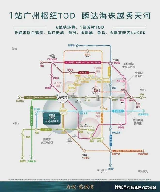 地铁网络:项目距地铁1号线花地湾站约800米(数据来源:百度地图测距),2024年开通的11号线(环线)与22号线(南沙快线)交汇于芳村站,形成“三轨交汇”格局。