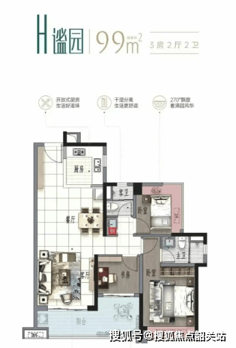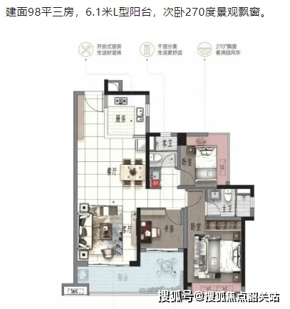 建面 98 平三房:拥有 6.1 米 L 型阳台,次卧配备 270 度景观飘窗,增加空间美感与采光。