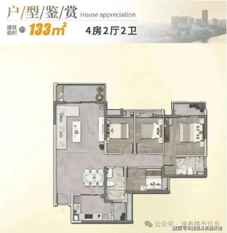 建面约133㎡天幕四房,三面单边采光,百变三阳台,既静谧亦亮堂,让三代同堂的温馨互动,自带诗意滤镜。