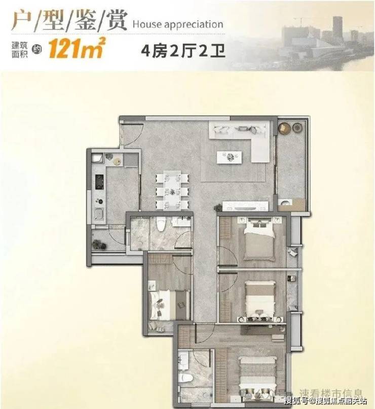 建面约121㎡天幕四房,东南朝向、四房朝阳,每间房都能感知江幕与阳光共舞的美妙。约4.5米的超阔客厅,巨幕采光面,也让每寸江岸时间都泛着优雅波光。