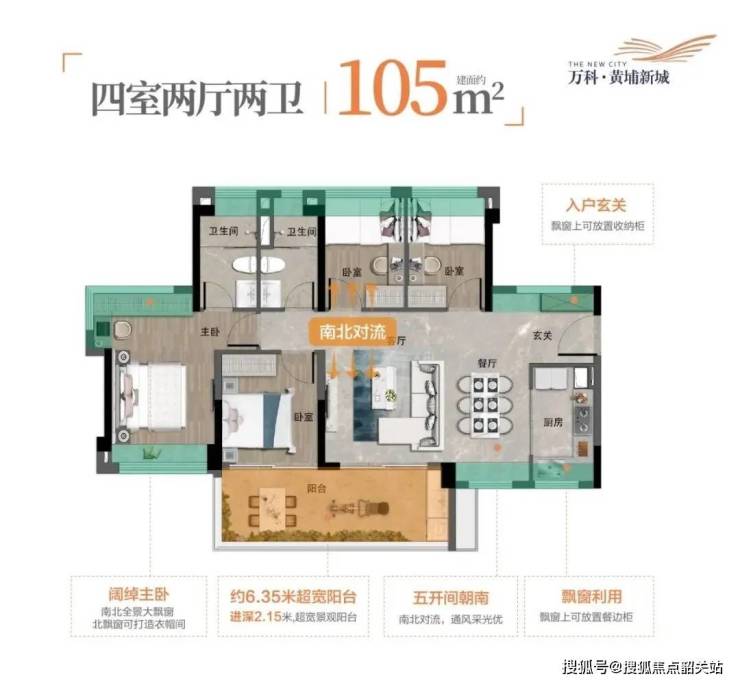建面105平南向四房两卫,南北对流,五开间朝南,6.35米长阳台,横厅设计,总价350-400万左右。