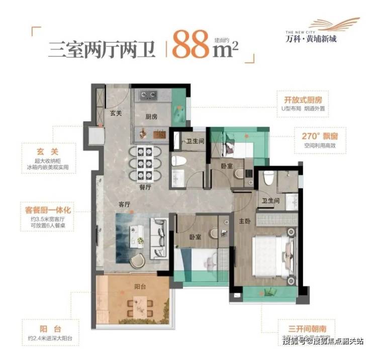 建面88平南向三房两卫,客厅LDK一体化设计,U型厨房,次卧270度飘窗设计,总价280-300万左右。