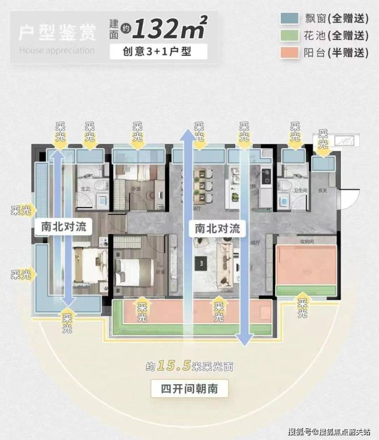 在售户型面积涵盖约112-134平方米,所有户型均朝向东南或西南方向,通过提升赠送空间实现了超100%的实用率。具体亮点如下: