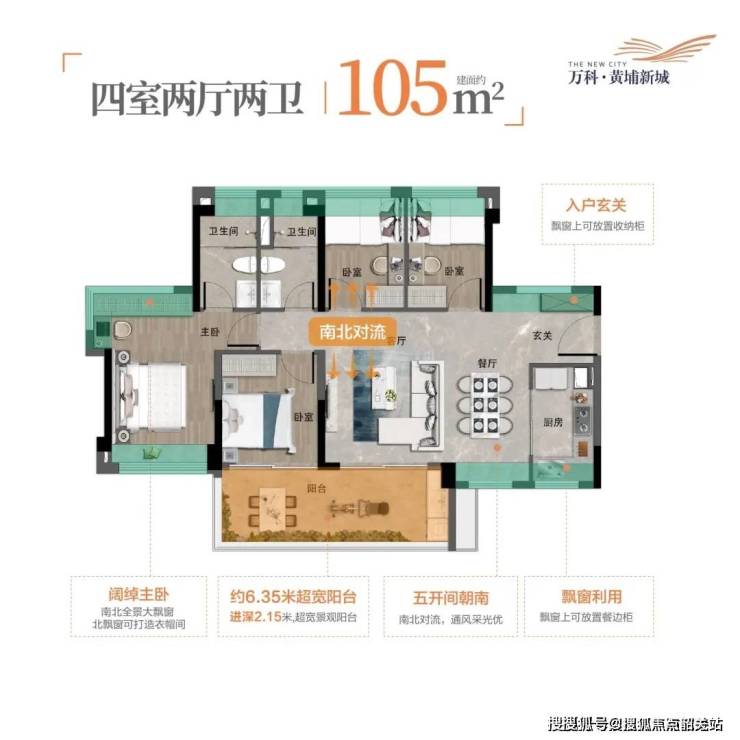143㎡四房:南北对流,主卧270°飘窗,赠送入户花园