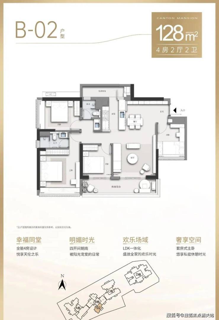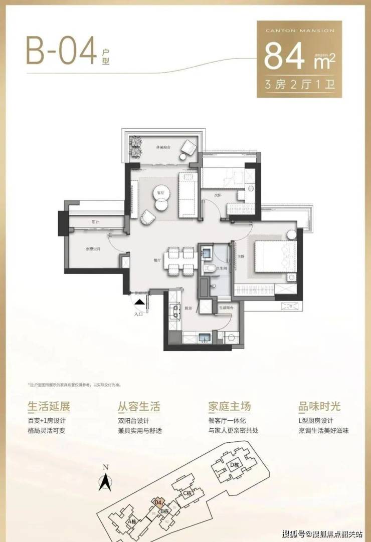 项目在售的B座建面约84-128㎡三四房,三梯四户。