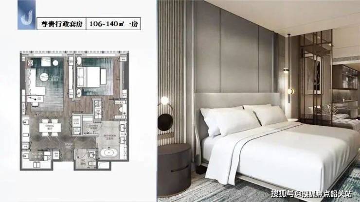 尊贵行政套房:106-140㎡一房,空间宽敞明亮,适合单身贵族或情侣居住。