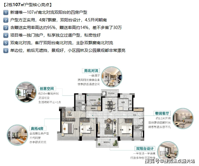 107㎡户型(四房):此户型为南北对流双阳台的四房设计,方正实用,有 4 房 7 飘窗。含赠送实用率高达约 95%,赠送率高约 14% 。项目唯一独门独户,私享独立过道,私密性好。客厅双阳台、主卧双飘窗均南北对流,单边位设计,前后无遮挡,可观赏小区园林及公园景观。