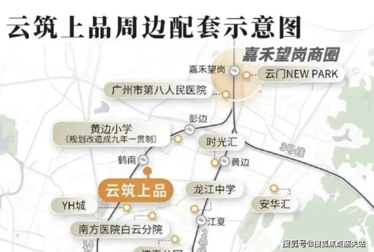 云筑上品位于白云新城设计之都板块核心地段,地理位置优越,周边交通便利。项目距离14号线鹤南站约200米(在建),1公里范围可抵达2号线黄边站,未来14号线开通后,将大幅缩短通勤时间。自驾出行同样便利,约35分钟可到达天河、海珠等CBD核心区,形成高效通勤网络。社区地下二层车库直接与14号线出口相连,无论天气状况如何,居民都可轻松出行。区域内规划多条城市主干道,周边公共交通线路丰富,满足日常通勤、购物及休闲出行需求。同时,项目临近白云新城核心区域,未来随着设计产业集群及总部经济的逐步发展,交通便利性将进一步提升,楼盘区位优势将更加明显。