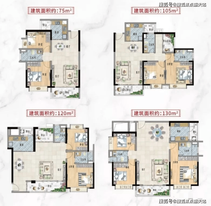 项目总建筑面积约28万㎡,由12栋高层住宅及2万㎡商业街区组成,容积率3.2,绿化率35%。规划建设18班幼儿园、社区健身中心、老年活动中心等全龄配套,打造"5分钟生活圈"。建筑采用现代简约风格,外立面选用LOW-E中空玻璃,搭配铝板装饰线条,彰显品质感。项目在售户型包括:77方(两房一卫),105方(三房两卫),119方(三房两卫),123方(三房两卫),130方(三房两卫),如下图: